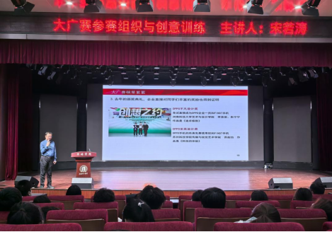 本网讯(特约记者/张允)4月22日下午,传媒学院在东校区21教演播厅举办“大广赛参赛组织与创意训练”专题讲座。讲座特邀河南大学新闻与传播学院宋若涛教授担任主讲人,传媒学院院长李存教授主持讲座,广播电视编导、网络与新媒体、播音与主持艺术等专业200余名师生参与活动。