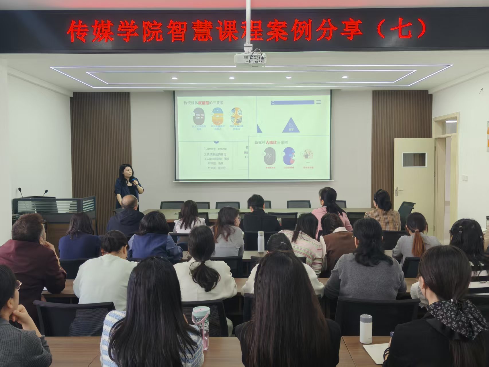 本网讯(特约记者/张三霞)2025年9月30日下午,传媒学院举办了第七场智慧课程案例分享活动。本期分享由播音与主持艺术专业吴楠老师主讲,副院长王玉良主持,全院教师参与。