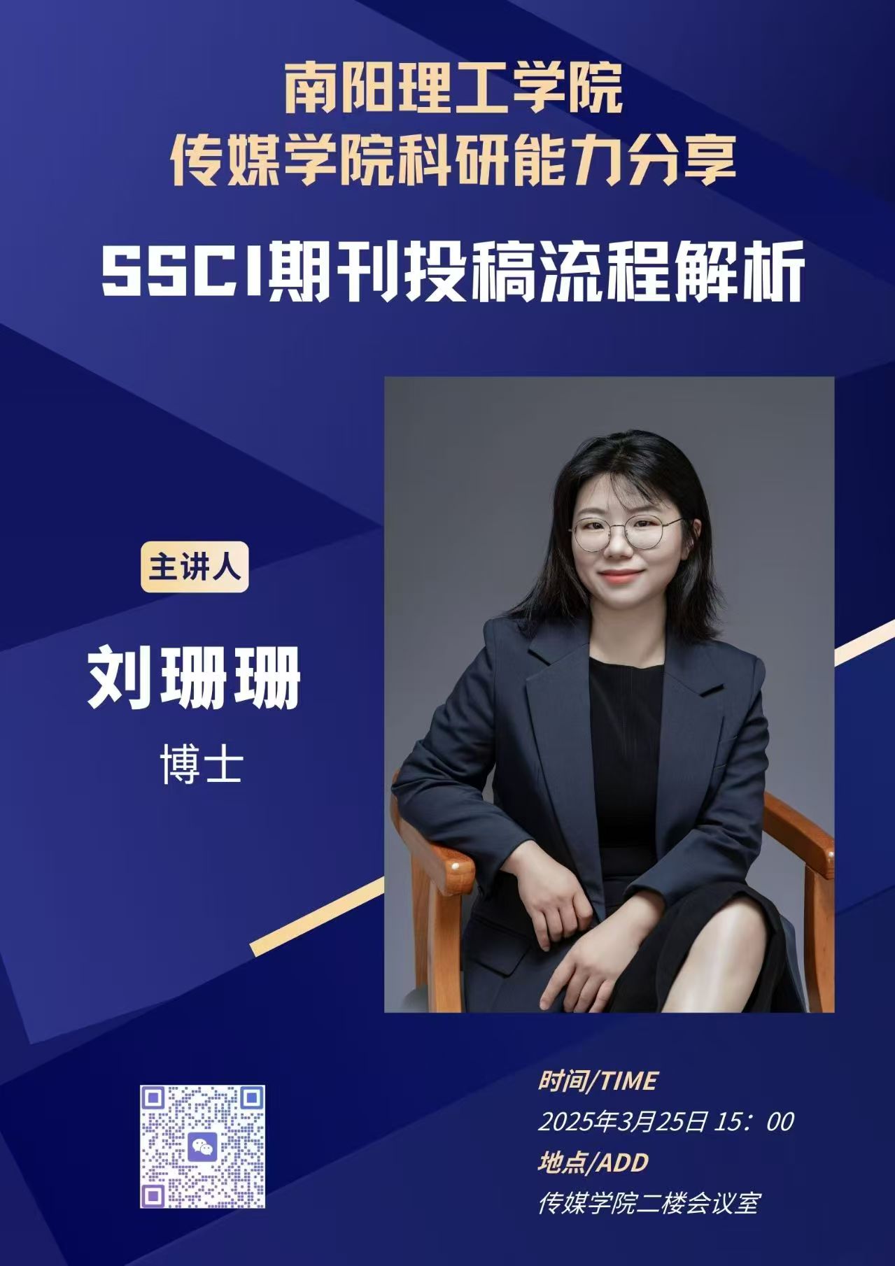 刘珊珊博士本次讲座的主题为“SSCI 期刊投稿流程解析”,她结合自身在SSCI 期刊发表文章的经验心得,系统梳理了从选刊到文章发表出版的全流程关键要点。讲座重点围绕三大关键问题展开:精准选刊的策略技巧,SSCI 期刊审稿流程与应对策略,自身投稿成功案例分享。