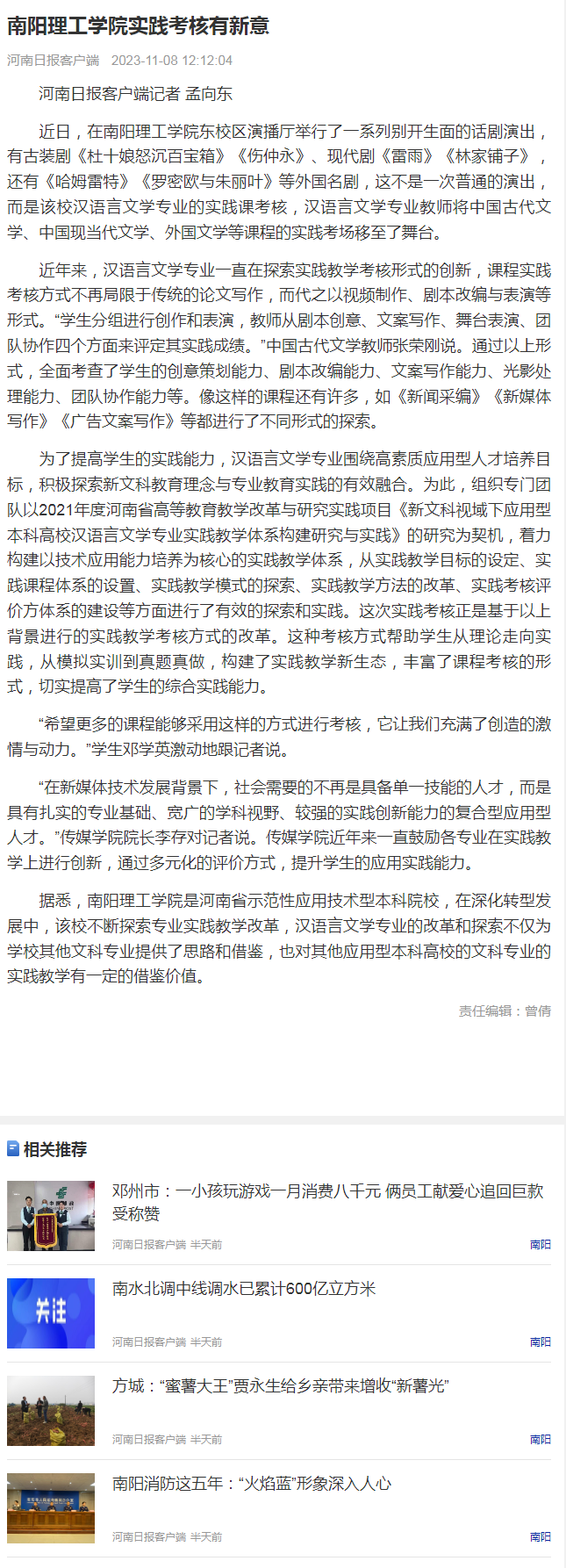 课堂实践、故事工坊、诗词大赛、汉字大赛······这是你们的“修仙炼气”术,是你们的“华山论剑”诀,文学创作、媒体文案、创意策划,各种实践活动等你来挑战,让你在实践中锻炼自己,未入职场即已具备硬实力。 近两年学生在专业及学院公众号发表各类作品300多篇,发表网络文学作品多部,学生参与制作的实践基地抖音短视频账号月浏览量4亿+;在全国“中华诵”经典诵读大赛、河南省“互联网+”大学生创新创业大赛、河南省大学生校园征文大赛、河南省汉字大赛等赛事中获奖20余项;学生参加大学生科研基金项目、大学生创新创业训练计划8项,公开发表学术论文5篇。