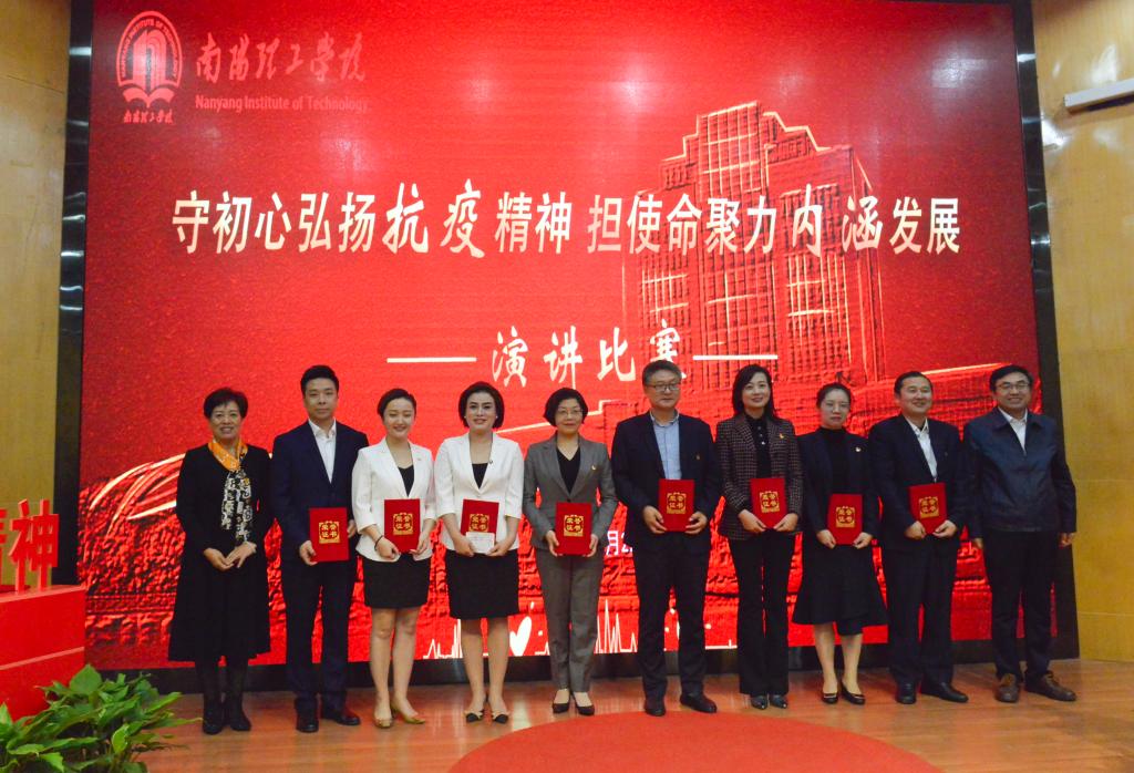 本网讯 (特约记者/张宁)10月22日下午,我校“守初心弘扬抗疫精神,担使命聚力内涵发展”教职工演讲总决赛在领创空间二楼报告厅举行。我院分工会派出的陈硕、张允、张宁三位老师以《弘抗疫精神,守教育初心》获得演讲比赛一等奖。校党委书记刘荣英、校长安士伟为一等奖获得者颁奖。