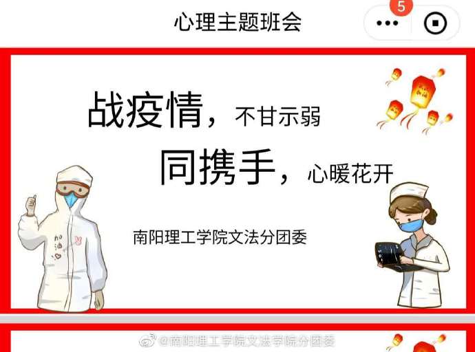 【本站讯:学生记者:王路遥】2020年3月1日,文法学院全体同学在各自己家中凭借网络直播的形式举行了“战疫情,不甘示弱;同携手,心暖花开”主题班会。此次班会由文法学院分团委组织召开,由各班班委担任主持人,全体同学共同参与。