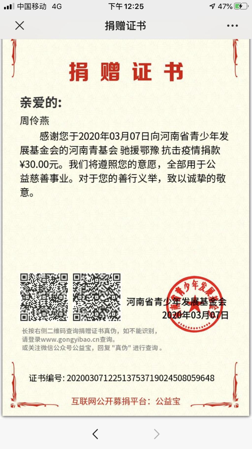 (图二为周玲燕的捐款证明)