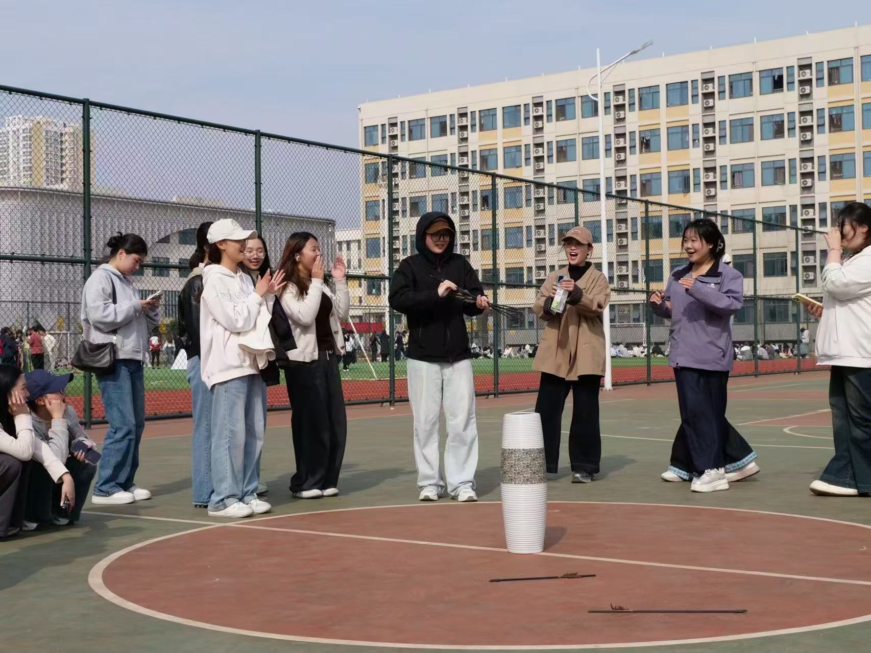 “投篮/投壶”:每班5名男生专注篮球投射,5名女生参与投壶挑战,精准投掷与稳定发挥成为比拼核心,现场竞技氛围持续升温。