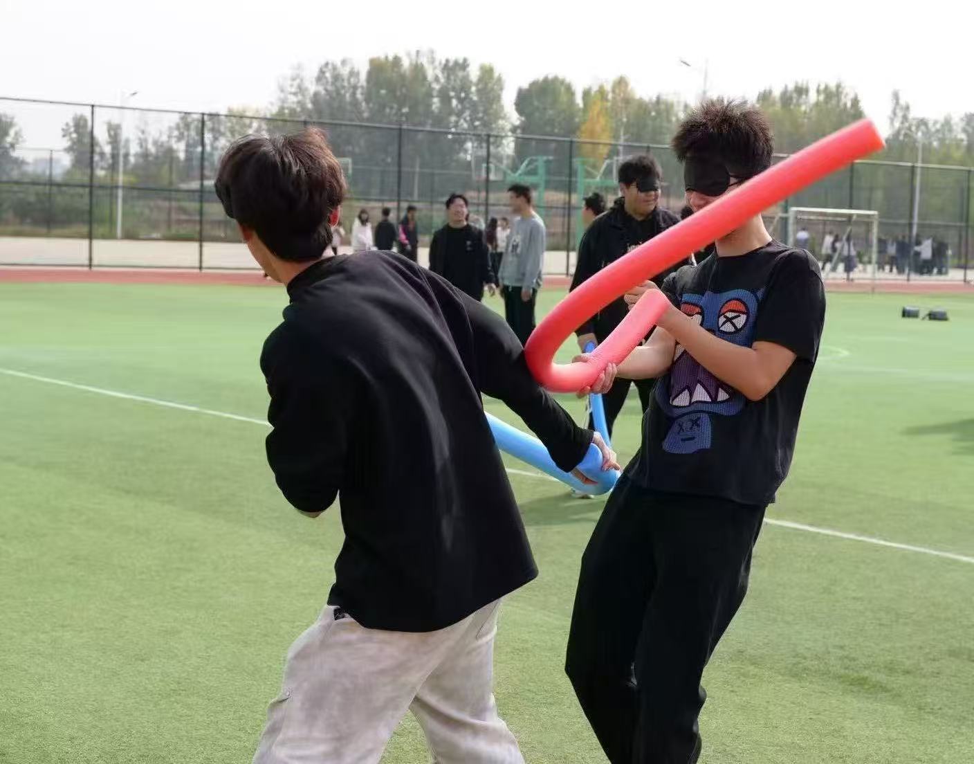 趣味蒙眼泡沫战:自由组队的同学们佩戴眼罩持泡沫棒博弈,每轮三分钟的限时对抗里,笑声与“战况”交织,逐步打破了彼此间的隔阂。