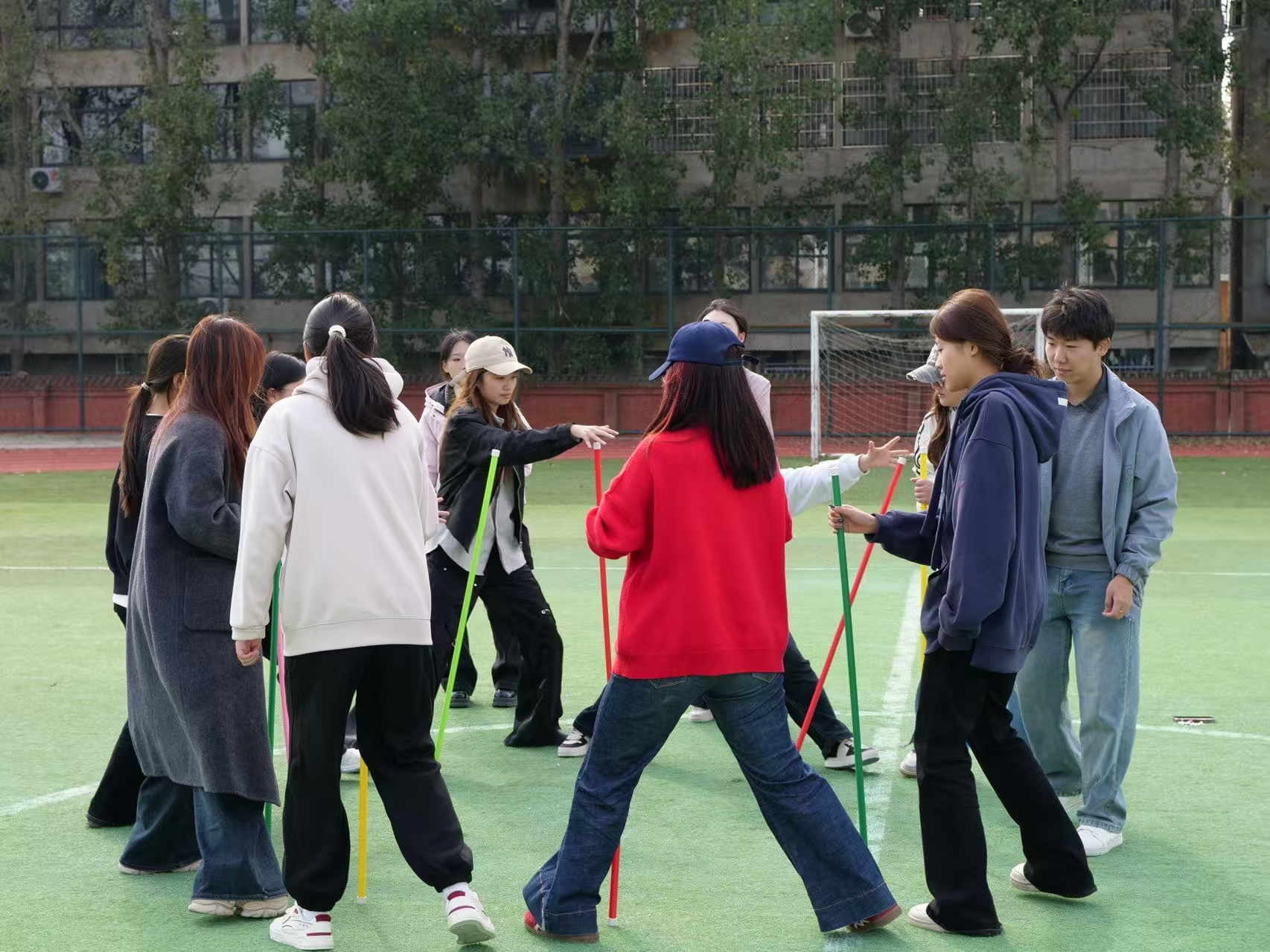 “不倒森林”:同学们手持道具围圈交替换杆,通过喊口号校准步调、快速磨合,在挑战中深化信任,体悟“众行远”的协作真谛。