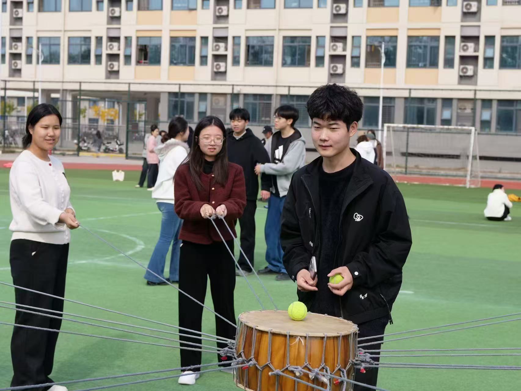 “鼓动人心”:同学们通过绑绳控制鼓面颠球,他们全神贯注,在反复尝试中快速磨合,逐渐摸索出了团队协作的最优节奏。