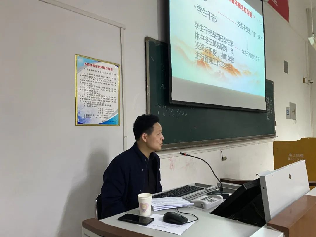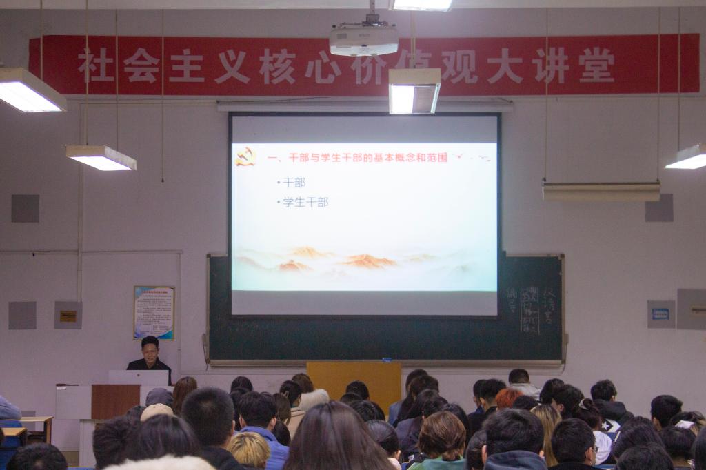 为了明确我院学生干部的基本职责,提升学生干部的管理能力,以便更好地服务广大同学,3月11日晚七点半,我院在14教202教室举办了一场以“如何成为一名合格的学生干部”为主题的讲座,由我院党委书记刘书营主讲,团学办主任郑丹丹、辅导员杨军、张杨子以及全体学生干部参与。