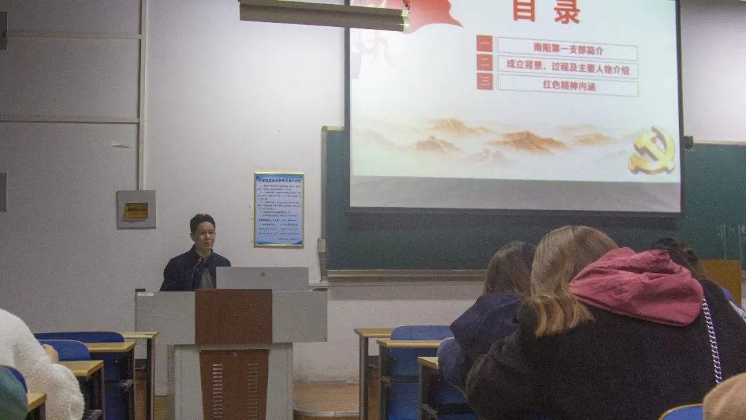 本次党课中,刘书记首先为大家讲述了学习党史的重要意义,然后围绕我党在南阳成立的第一个支部——中共南阳第一支部的筹建背景、过程、工作开展情况以及主要人物事迹等方面进行了详细介绍。从“北方革命形势“、“党的工作部署”、“南阳的地理位置”三个部分进行深度分析,向同学们清晰地勾勒出第一支部的建立和发展轨迹,并重点讲述了南阳第一支部所蕴含的红色精神内涵。