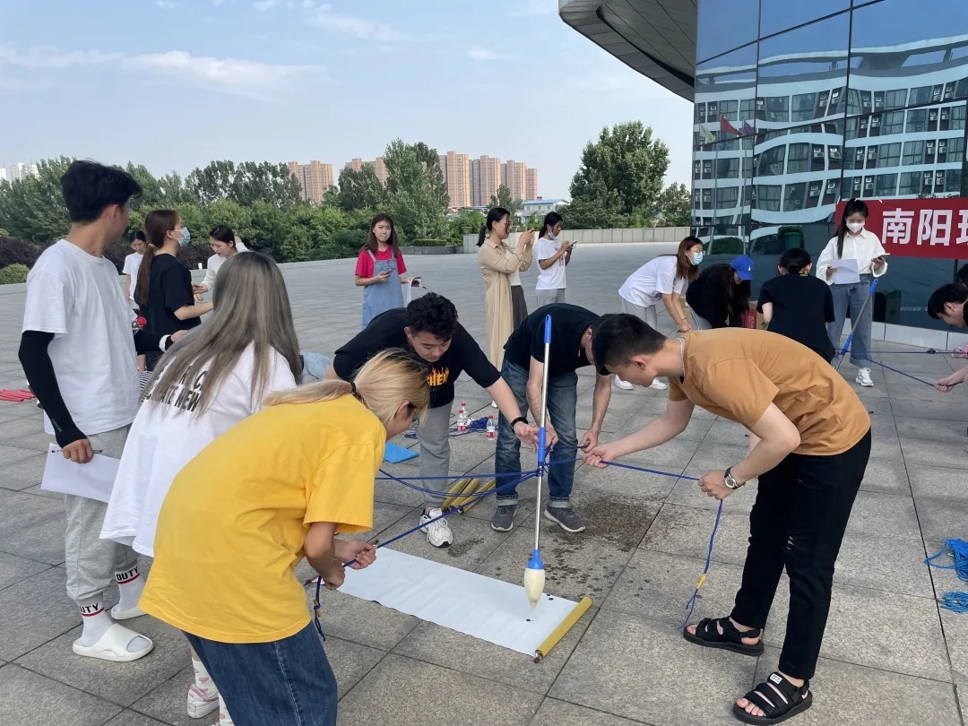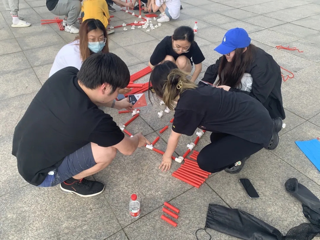 “团队金字塔”,同学们需要按照流程图将一根根塑料棍连接在一起,拼成金字塔的模样。长短不一的塑料棍拼接起来十分考验同学们的判断力,他们在烈日炎炎下努力克服困难,冷静沉着地完成模型的搭建。模型搭建完成的那一刻,同学们脸上纷纷洋溢起灿烂的笑容。