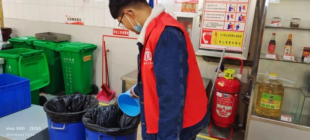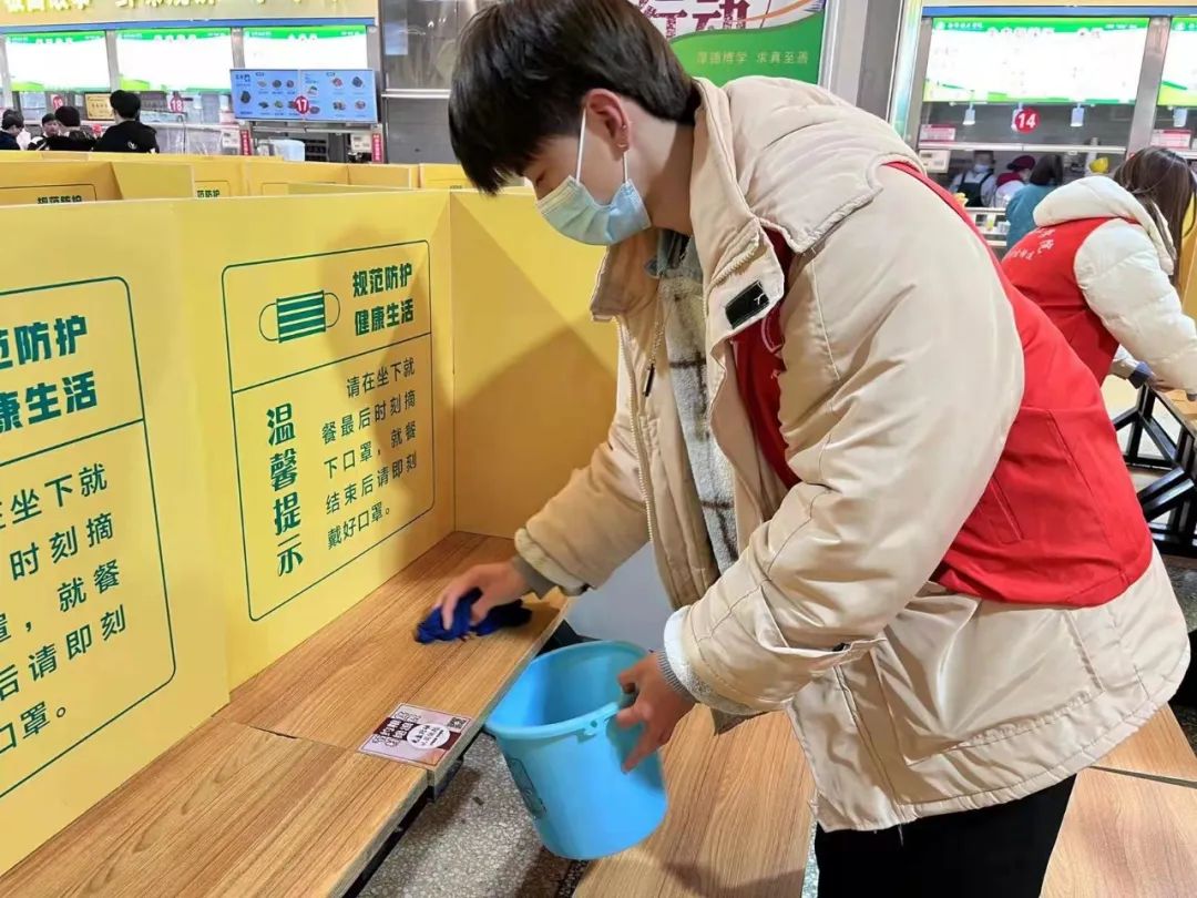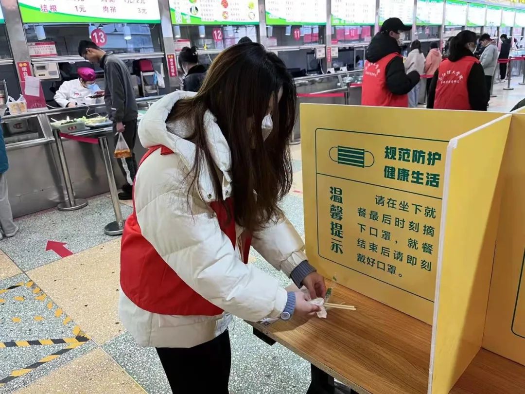 活动准时开始,志愿们按时签到并分为三组,活动过程中第一组志愿者分工有序的宣传活动内容,将习近平总书记关于爱惜粮食、杜绝浪费的指示精神进一步落实到校园,第二组志愿者以身作则引导同学们做出正确的用餐行为,获得同学们的积极响应,第三组志愿者主动帮助食堂阿姨打扫餐桌,切身体验,落实行动。