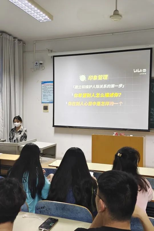 班会中,主持人还讲述了作为大学生应该如何进行社交,怎样社交,在场同学也听得十分认真。在抢答互动环节中,同学们积极主动地与主持人互动交流,分享自己的社交故事,陈述自己对社交的看法。在活动接近尾声时,活动负责人还组织各班同学观看相关主题电影。