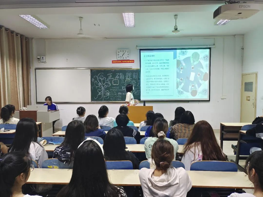 “在大学中,学习和社交是相辅相成的,学习是必须的,社交是必要的。”本次活动中,各班班会讲解人通过列举恰当的社交故事,向同学们讲解社交在大学生活中的重要性,应当重视社交。