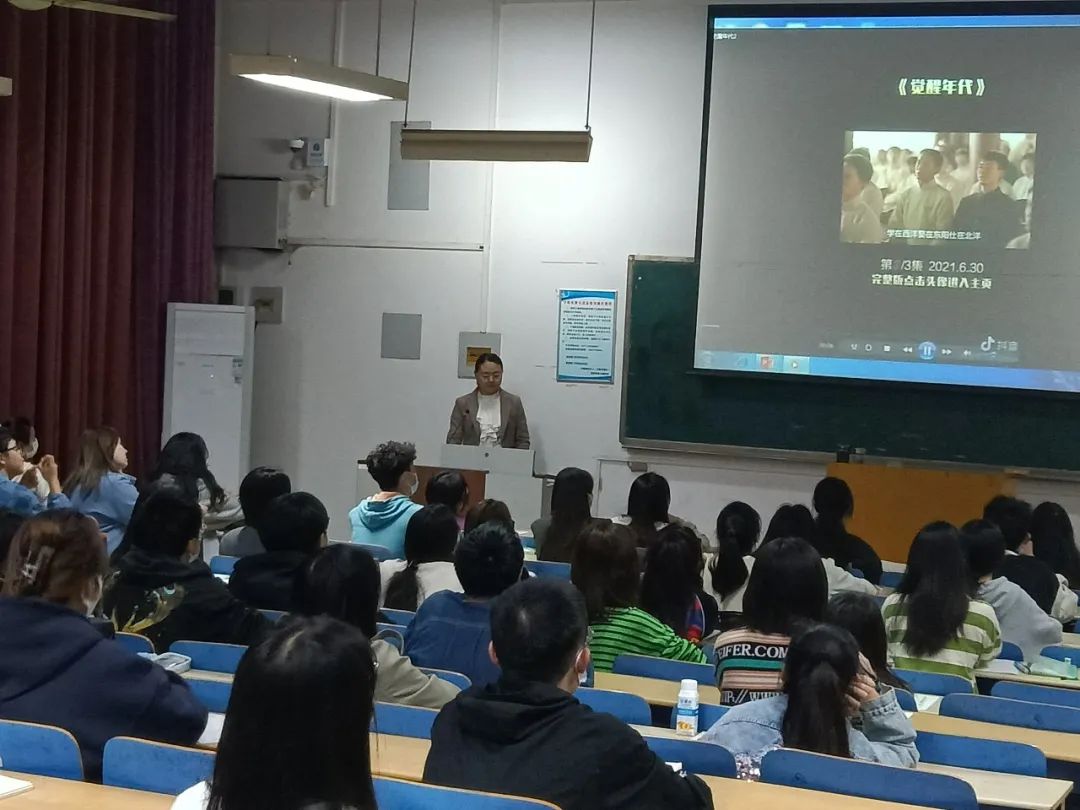 在本次党课中,郑丹丹老师先通过几个短视频来向大家介绍了《觉醒年代》这部革命历史题材的优秀电视剧。给大家展现了从1915年《青年杂志》问世到中国共产党成立这一段伟大的历史进程,清晰地反映了马克思主义的传播和中国共产党创建的全过程。引发了同学们对于其背后革命精神史的思考。