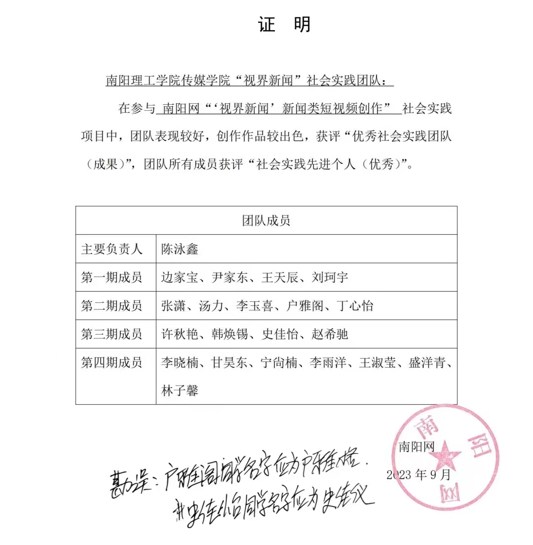 2023年9月15日,由传媒学院播音与主持艺术专业学生组成的“视界新闻”社会实践团队,荣获南阳网“优秀社会实践团队”“社会实践先进个人(优秀)”等荣誉。