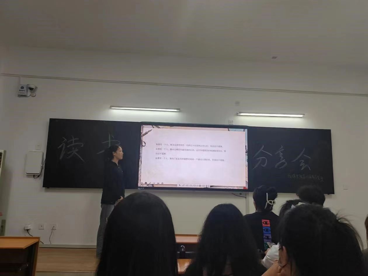 读书分享会以轻松、欢快的气氛举行着,三组同学以多种形式轮流上台发言,向其他人推荐自己读到的好书,并和大家分享自己从书中得到的感悟。同学们在分享会中不仅收获了好的书籍,丰富了自己的知识储备,更在思维碰撞和不断地思考中,坚定了自己的理想信念。