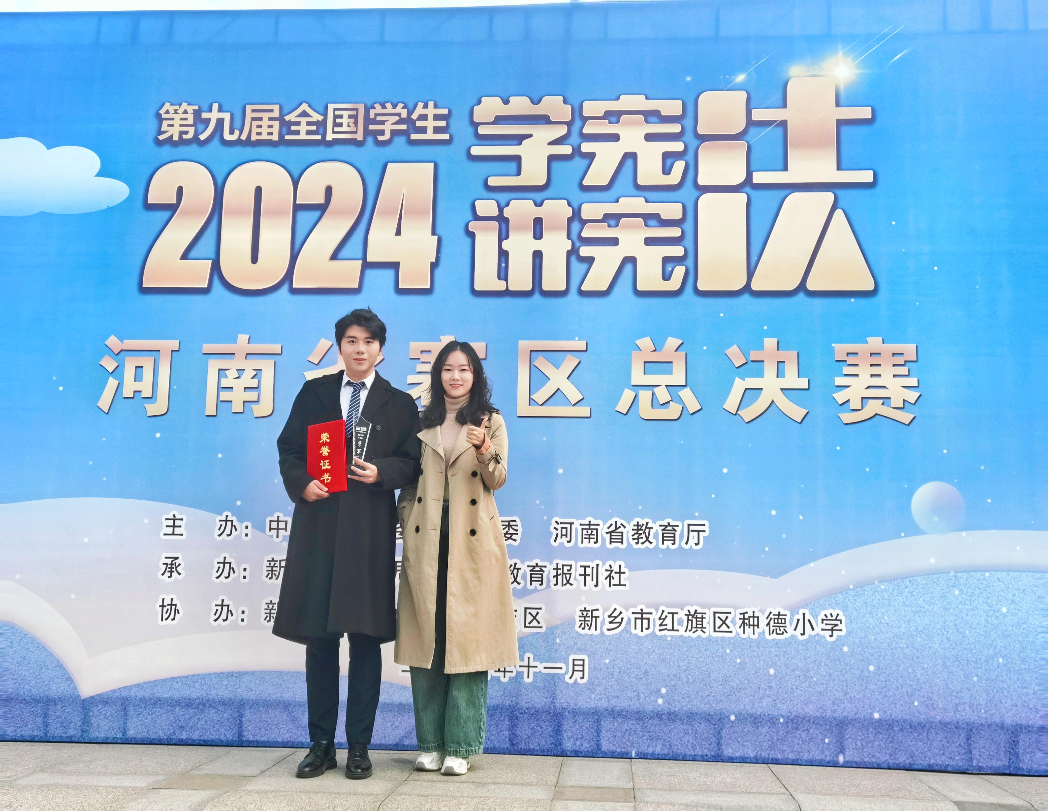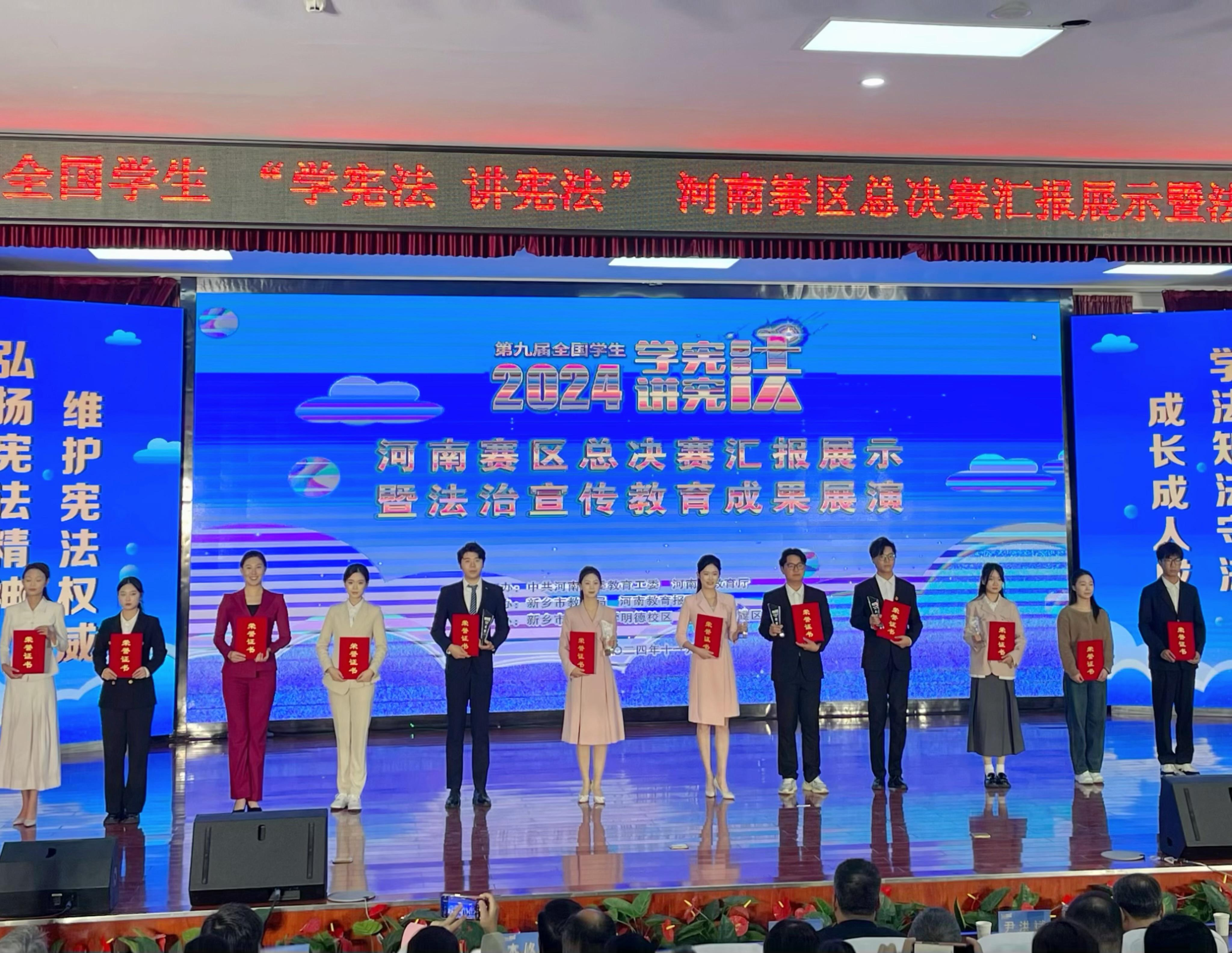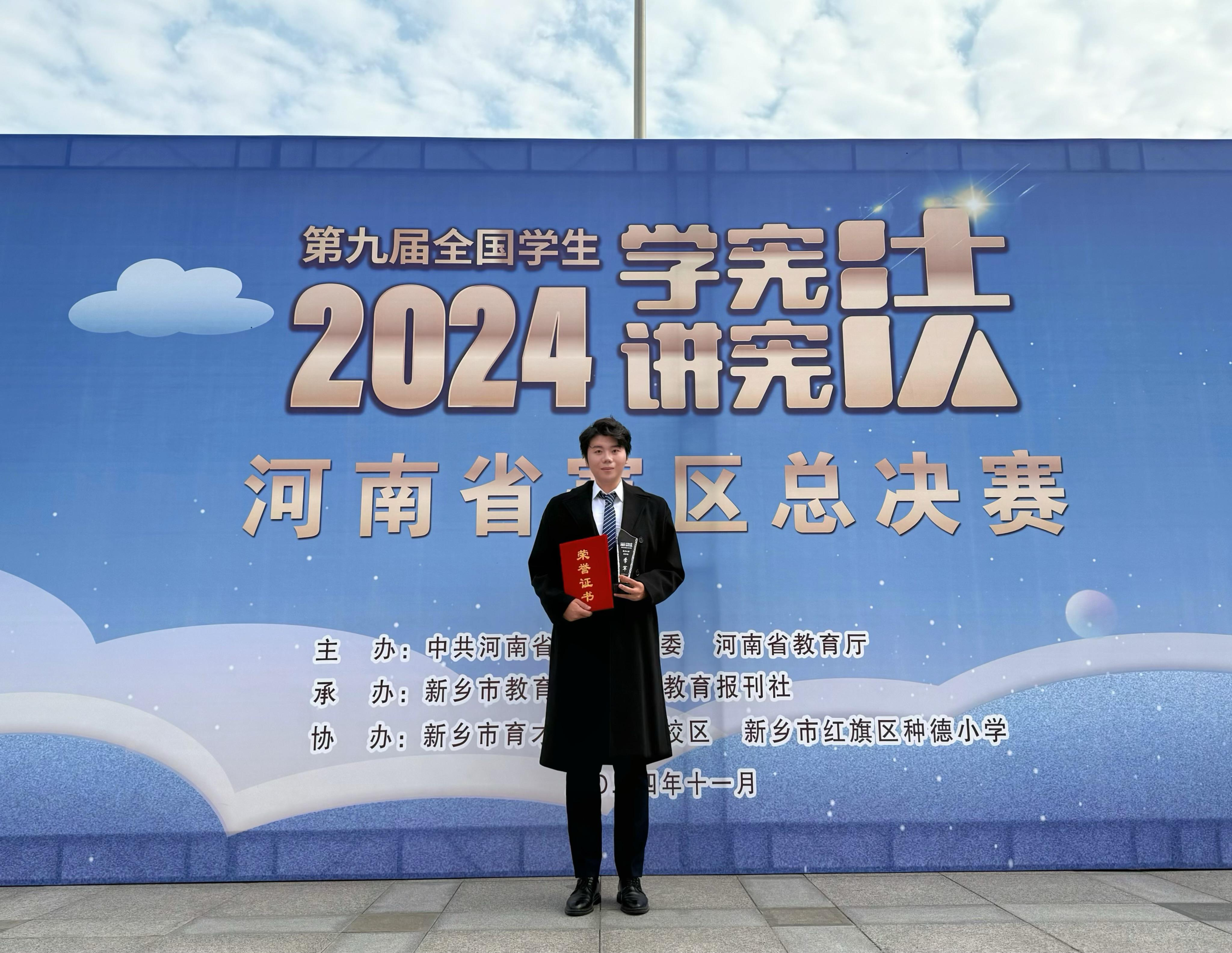11月5日至8日,由中共河南省委教育工委、河南省教育厅主办,新乡市教育局与河南教育报刊社承办的第九届全国学生“学宪法 讲宪法”河南赛区总决赛于新乡市完美收官。其中我校传媒学院播音专业的黄嘉辉同学历经决赛的层层筛选,从高校组多名参赛选手中脱颖而出荣获演讲比赛的季军,创下我校在该赛事的最佳成绩。