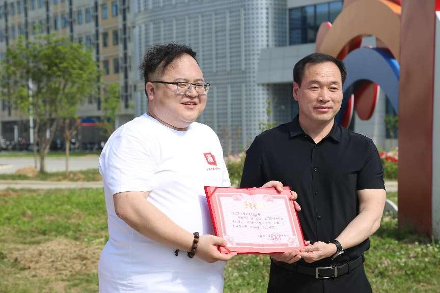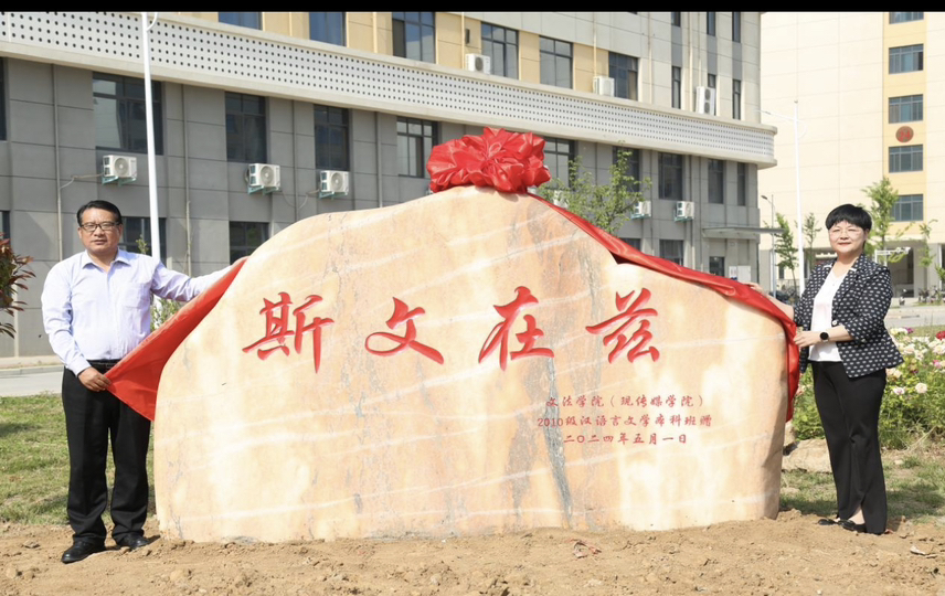 当天,还举行了校友捐赠的“斯文在兹”石碑揭幕仪式。在现场校友和师生的共同见证下,南阳理工学院副校长葛晨光和传媒学院院长李存共同为石碑揭幕。未来,这块石碑将作学院文化的一道亮丽风景线,激励师生继续前行,传承南工文脉,创造更加辉煌的未来。招生就业处处长祝孔涛代表南阳理工学院校友联谊总会为2010级汉语言班校友代表颁发了捐赠证书。