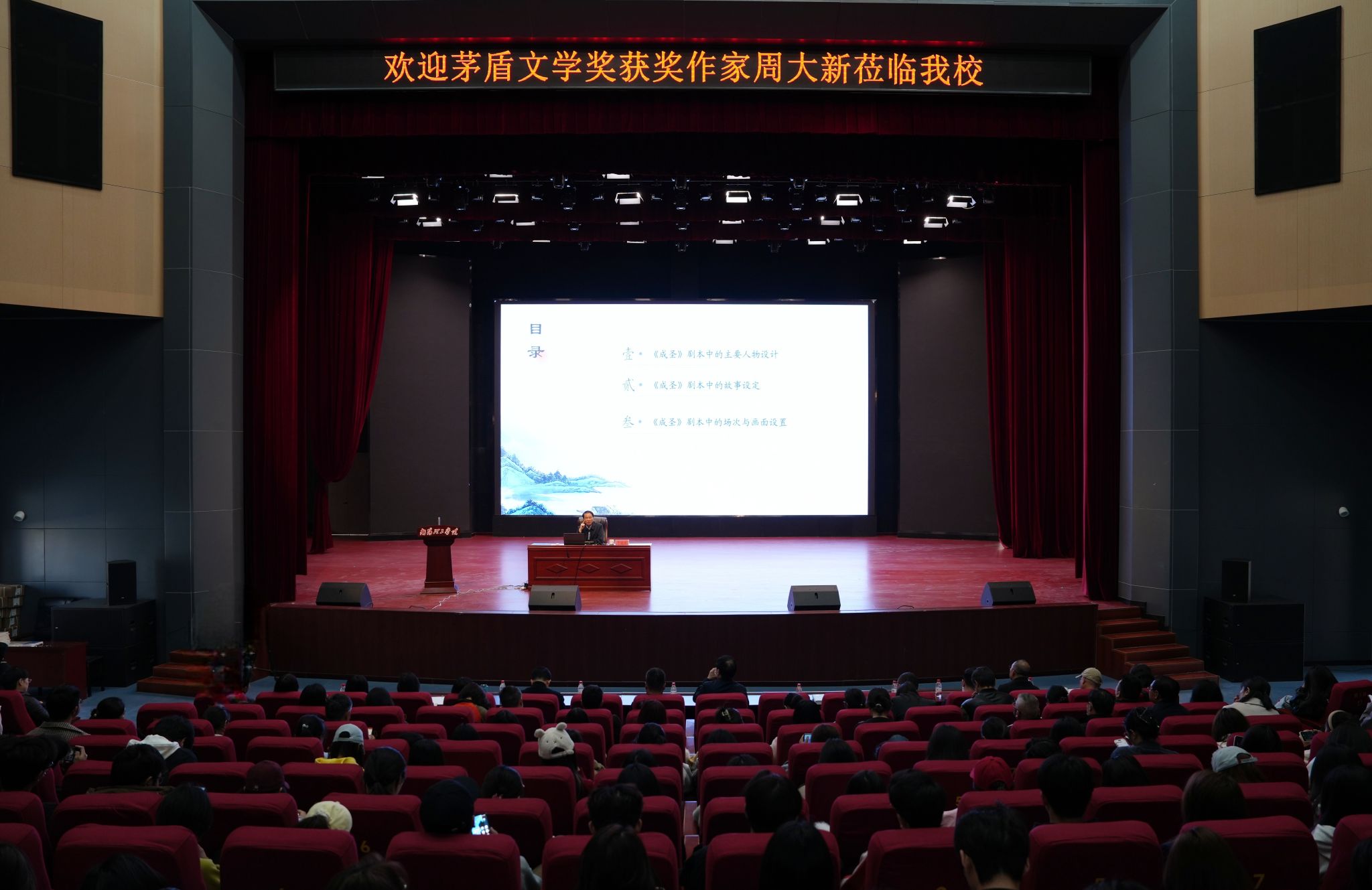 本网讯(特约记者/钟慧媛 张旭东)4月1日下午,茅盾文学奖获奖作家周大新在东校区音乐厅做了“连续剧作品的要素——从《成圣:张仲景》说起”的主题讲座。校长郝好山、党委副书记张爱红,南阳市文联相关领导以及传媒学院师生等600余人聆听了此次讲座。讲座由传媒学院院长李存主持。