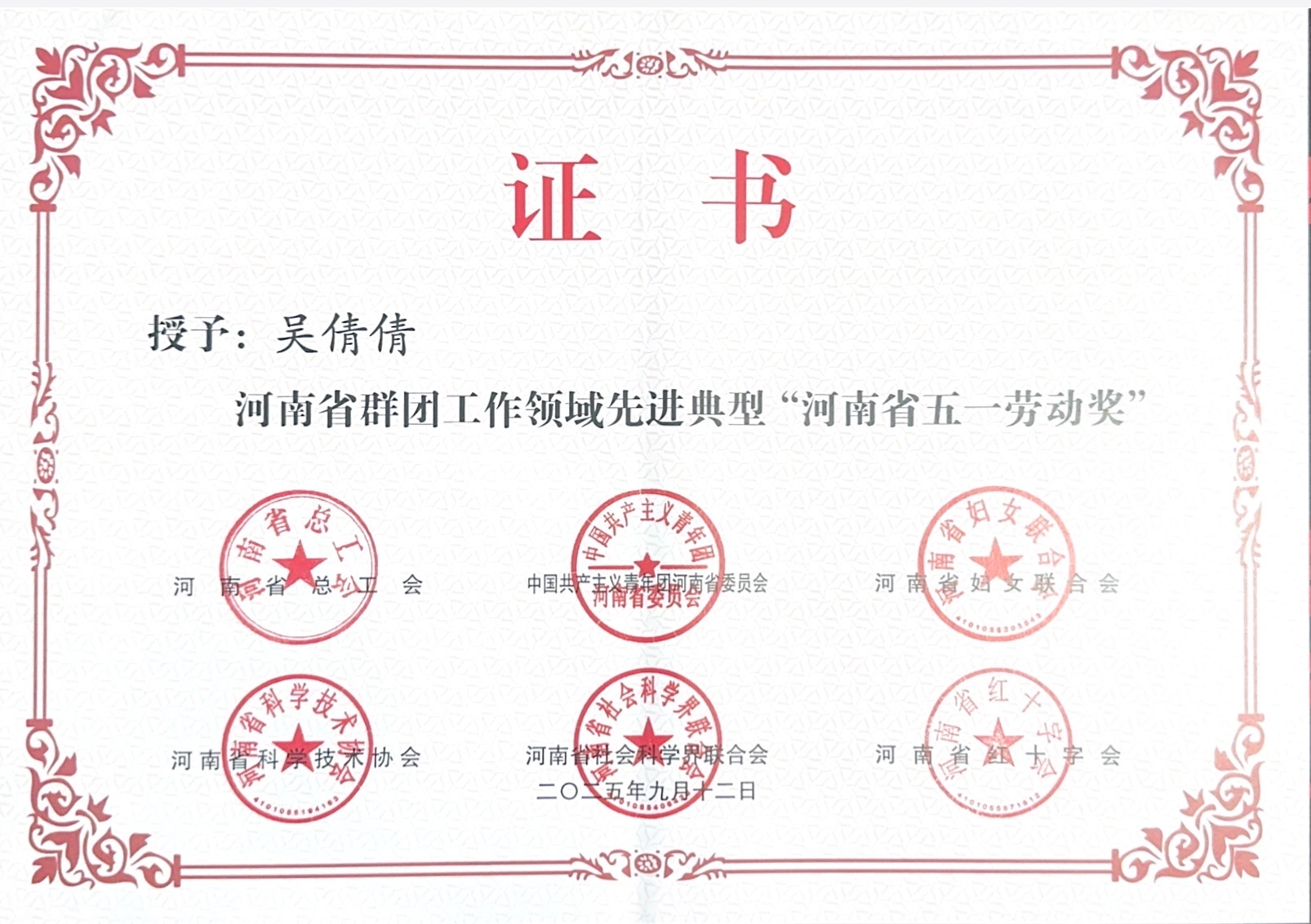 本网讯(特约记者/李志光)9月17日,2025年河南省五一劳动奖表彰大会在省人民会堂隆重召开。大会表彰了在全省各条战线上涌现出的先进集体和先进个人,进一步弘扬劳模精神、劳动精神和工匠精神。在此次表彰中,我院教师吴倩倩荣获“河南省五一劳动奖”,成为南阳市15名受表彰先进个人之一。