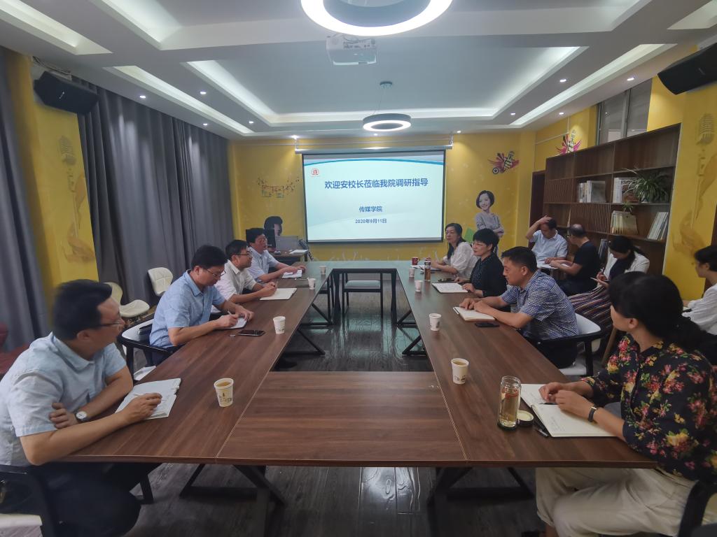 本网讯 9月11日下午,校长安士伟在党政办公室、人事处、科研管理处等部门负责人陪同下,来到传媒学院调研指导工作,学院领导班子成员和教研室主任参加座谈。