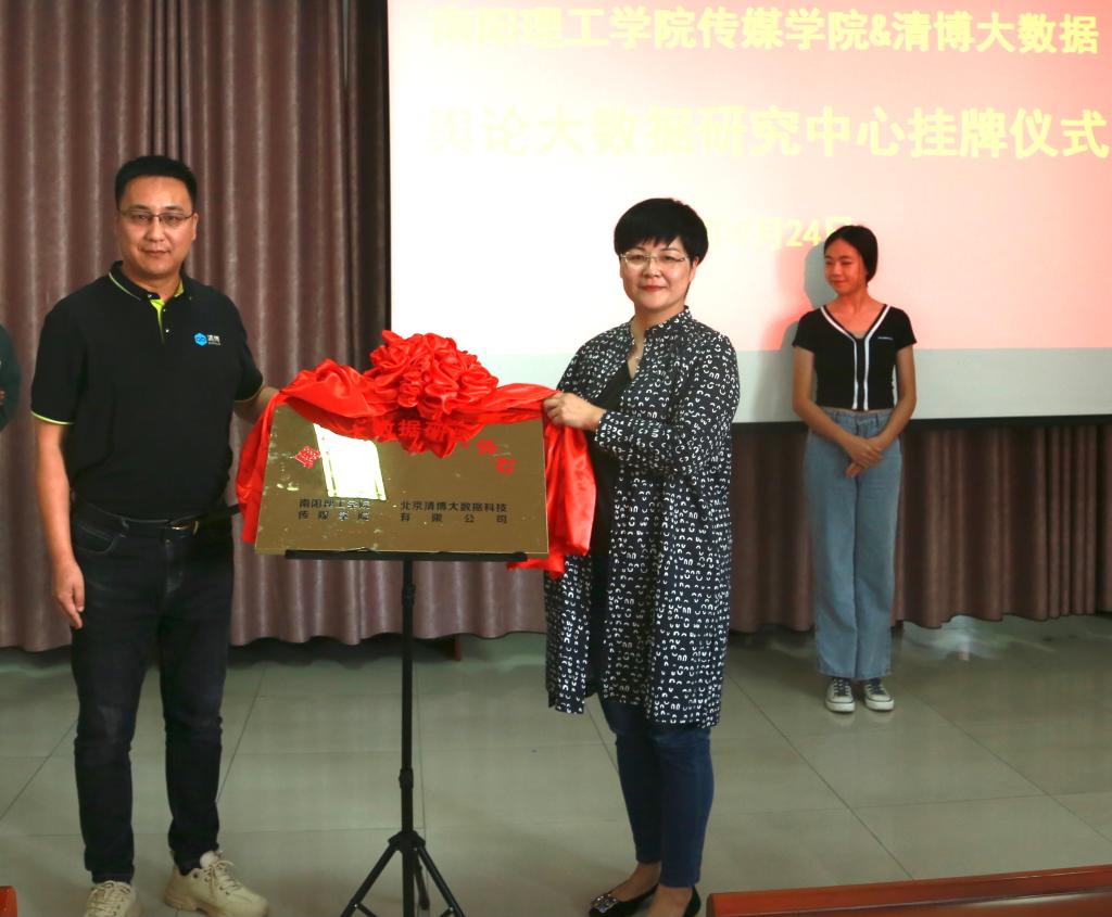 本网讯(特约记者/岳小玲 ) 9月24日,清博舆论大数据研究中心正式落户传媒学院,这标志着新组建成立的传媒学院再新增科研平台。传媒学院·清博大舆论大数据研究中心揭牌仪式当日在学院会议室举行,北京清博大数据科技有限公司华北区总经理王奎,河南地区商务专员张娅楠,校地合作处副处长杨怀坦和传媒学院院长李存,副院长王焕玲、骆志方等出席揭牌仪式。