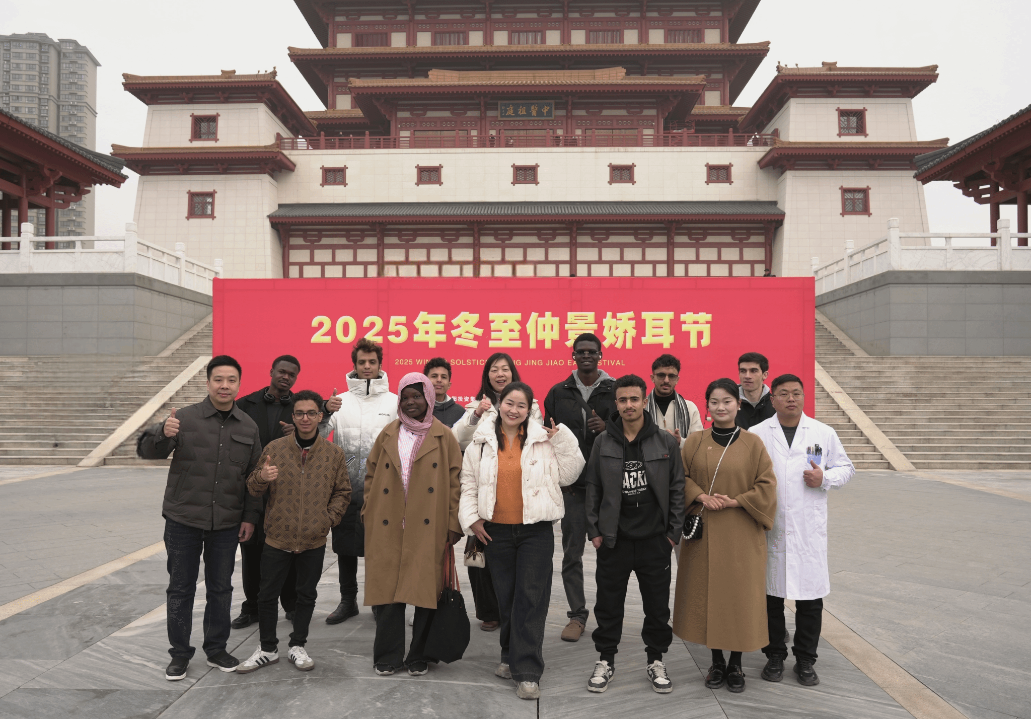 恰逢医圣文化园举办2025年冬至娇耳节,园区内精心布置的中医药主题展区、民俗体验区热闹非凡。留学生们穿梭于各个活动区域,近距离参与中医义诊活动,还兴致勃勃地参与了娇耳制作等民俗活动,在动手实践中感受中华传统节日与医药文化的融合之美。