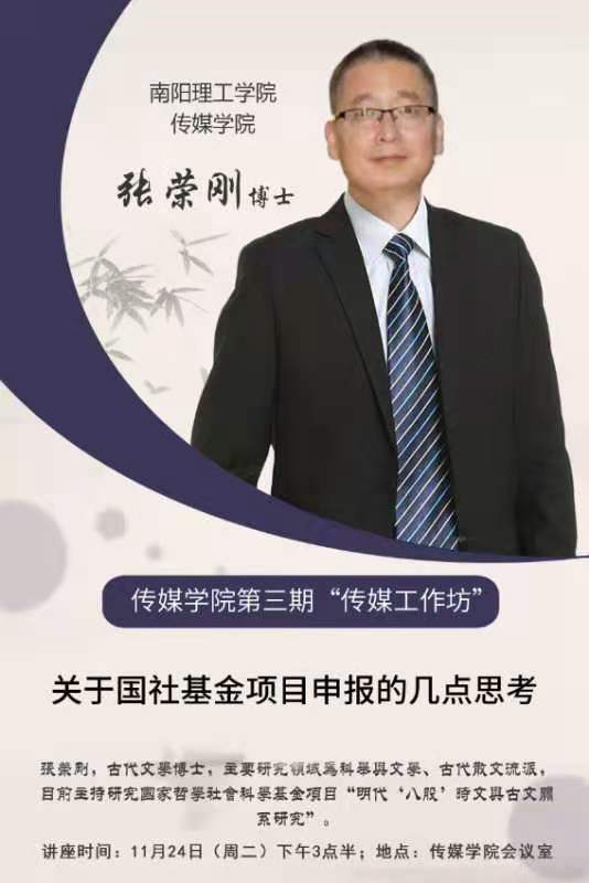 本网讯 11月24日下午,传媒学院副教授张荣刚博士担任第三期“传媒工作坊”主讲人,与全院教师就申报国家社会科学基金分享其自身的体会与感受。本期工作坊由副院长罗新宇主持并点评。