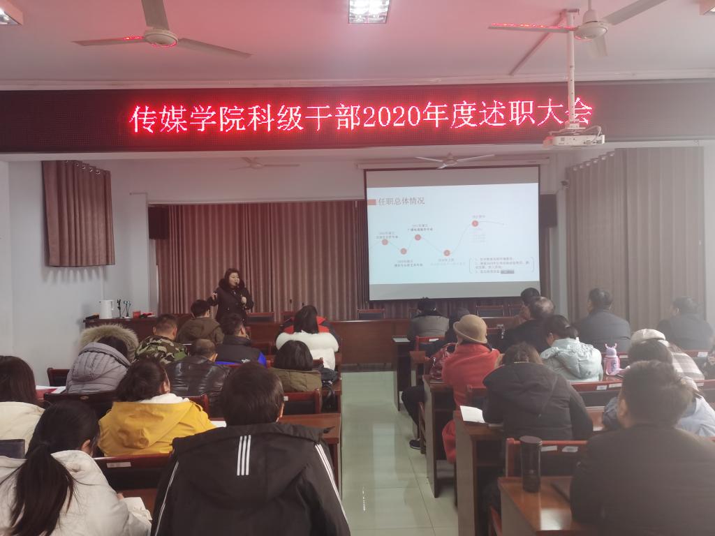 传媒学院各内设科室负责人结合各自工作职责和与学院签订的《目标管理任务书》,以PPT展示方式,图文并茂地向全院教职工汇报了日常管理、学生教育管理、教学、科研社会服务、实验室建设等方面工作的完成情况和取得的成绩,分析了差距与不足,并对2021年工作提出了设想。