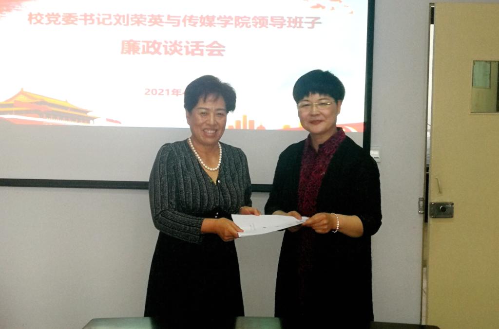 会上,传媒学院党委书记刘书营、院长李存当场向刘荣英书记递交了《党风廉政建设责任书》。刘书营表态,传媒学院领导班子将牢记刘荣英书记的嘱托,不忘初心、砥砺前行,以高质量党建引领传媒学院各项事业的高质量发展,打造传媒学院创新发展的新高地。