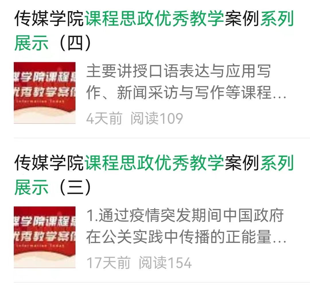 传媒学院结合“传媒学人教学科研创新竞赛”活动,要求每位教师围绕主讲课程,深度挖掘其中所蕴含的思想价值和精神内涵,设计一份课程思政教学案例。经过学院教学委员会评审,共选出17份优秀课程思政教学案例,学院将汇编成册并在传媒学院微信公众号上陆续刊发,推广课程思政教学改革典型经验和特色做法,营造 “人人重教学,课课讲思政”的良好氛围。
