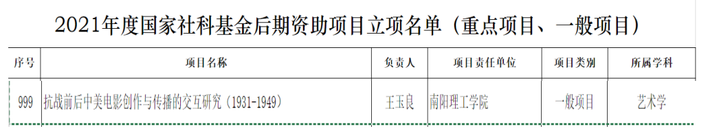 本次成功获批的项目由王玉良博士申报,项目名称为《抗战前后中美电影创作与传播的交互研究(1931-1949)》,项目类别为一般项目,所属学科为艺术学,资助经费为25万元。