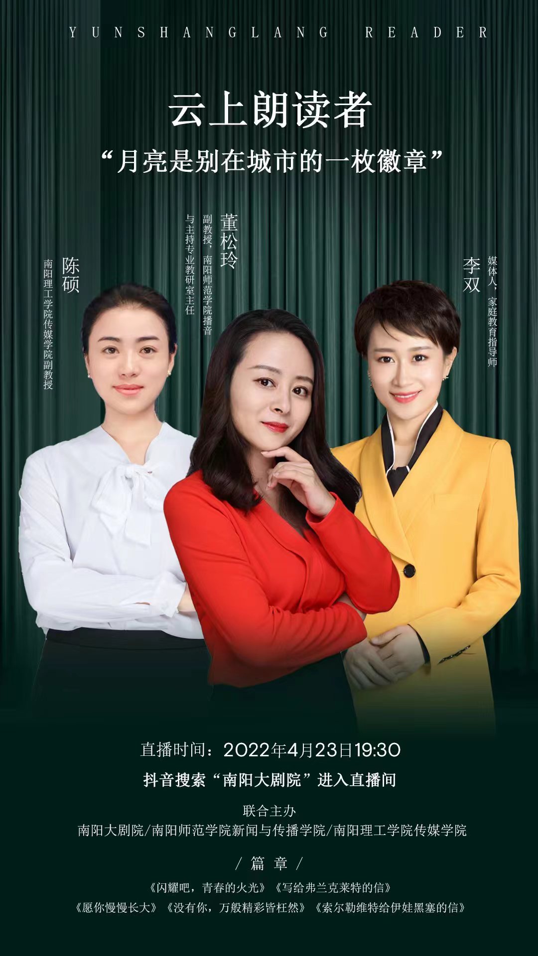 本网讯(特约记者/陈泳鑫)“最美人间四月天,不负春光与时间。”4月23日是第27个世界读书日,南阳理工学院传媒学院联合南阳师范学院新闻与传播学院和南阳大剧院共同举办“云上朗读会”,朗读会通过抖音直播与观众见面,我校传媒学院副教授陈硕担任朗读嘉宾。