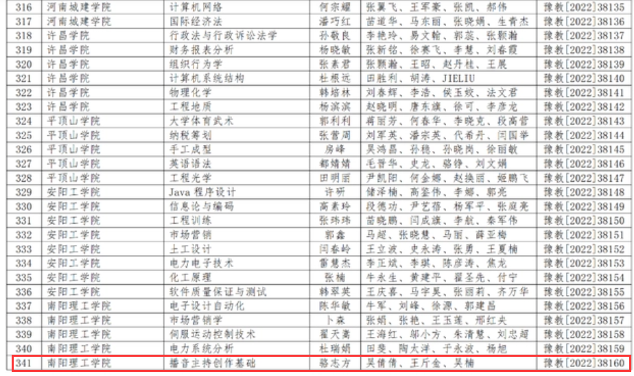 本网讯(特约记者/李志光)近日,河南省教育厅第三批河南省一流本科课程认定结果公示,我院播音与主持艺术专业教师骆志方、吴倩倩、吴楠等主讲的《播音主持创作基础》课程被认定为省级一流课程。
