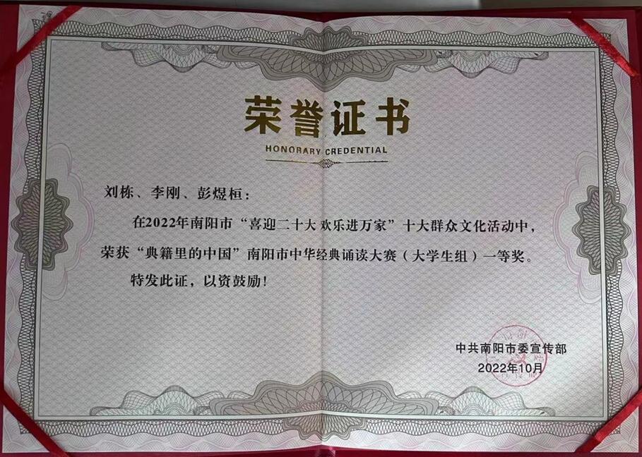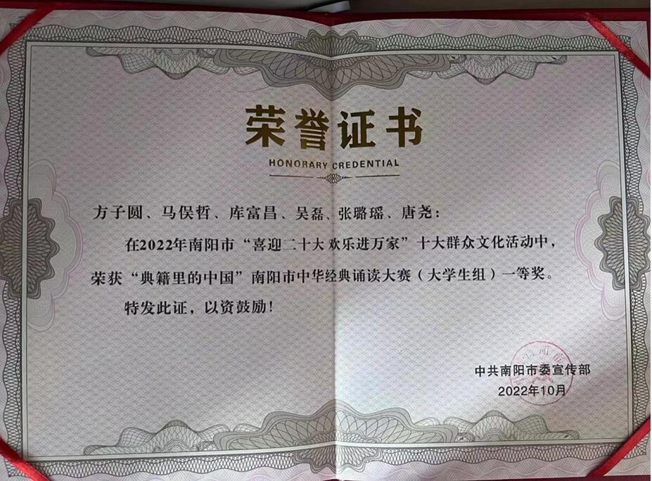 本网讯(特约记者/张璐瑶)2022年10月25日,由南阳市委宣传部“喜迎二十大 欢乐进万家”十大群众文化活动之“典籍里的中国”中华经典诵读大赛评选结果出炉,南阳理工学院传媒学院参赛作品《青春答卷》《我爱你,中国》荣获大学生组一等奖。
