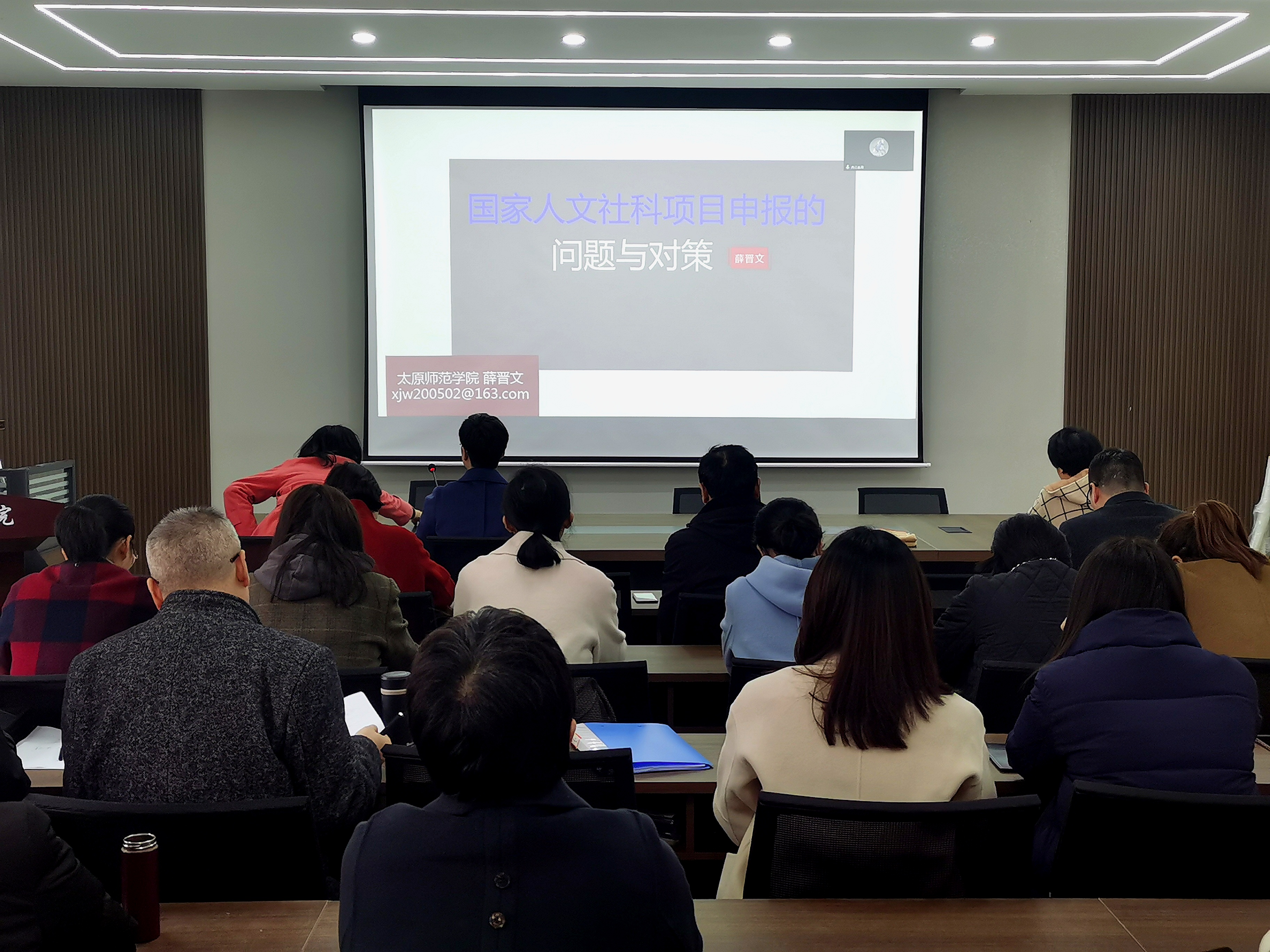 太原师范学院教授、博士生导师薛晋文首先以在线的形式为大家做题为“国家人文社科项目申报的问题与对策”主题报告。薛教授结合自身专业和科研心得,从国家人文社科项目的资助体系、国家人文社科项目的选题以及国家人文社科项目的论证等三个方面,详细深入地对如何申报国家社科项目、如何进行项目选题和论证进行了分享,并对如何提高申报成功率提出了建设性意见和建议;他最后勉励学院教师,要勇于科研、勤于科研,积极申报国家和教育部人文社科项目,无论申报成功与否,仅提炼选题和撰写申报书的过程,就能有效提升学术科研的问题意识和研究能力,从而带动教学能力的同步提升。