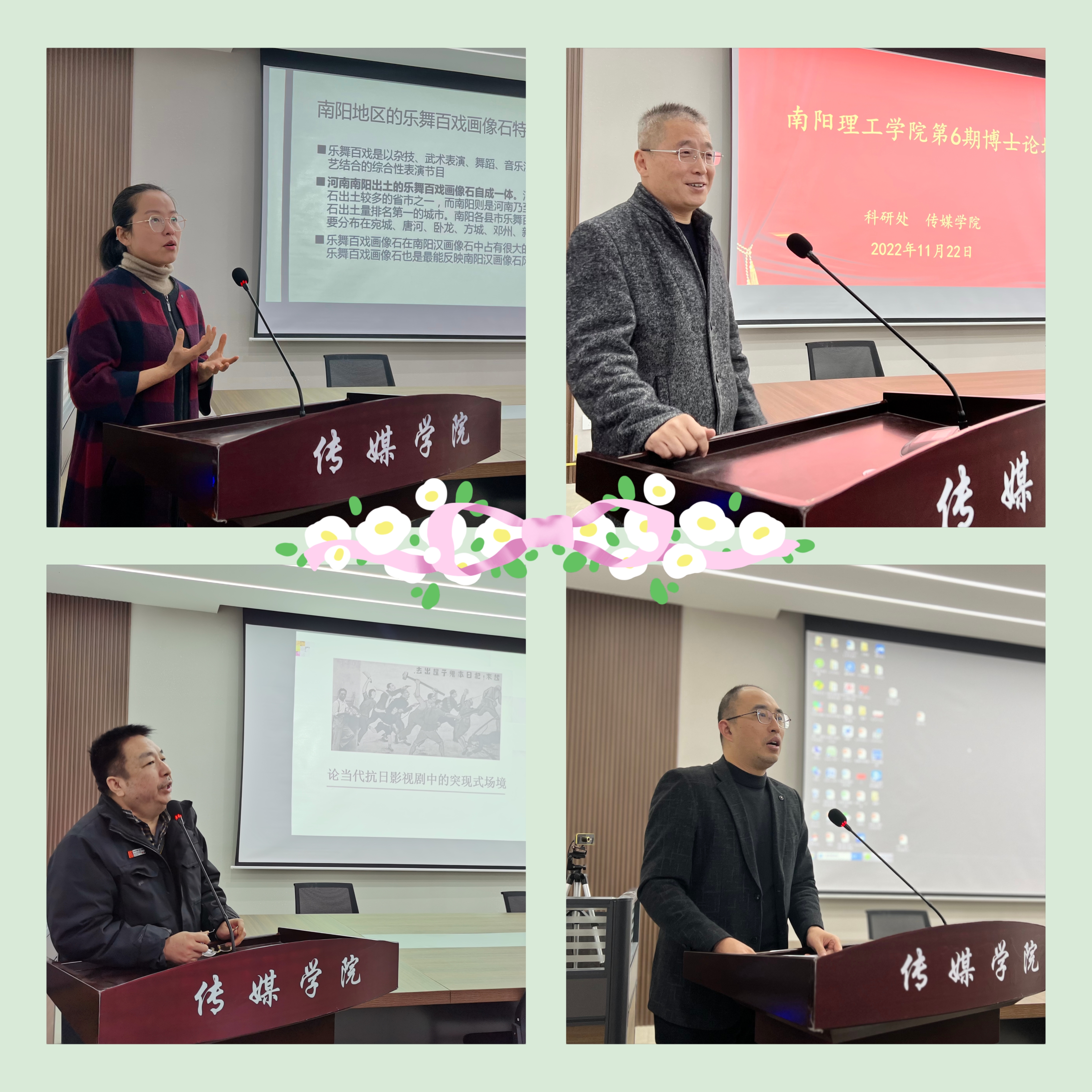 接下来,学院四位博士王玉良、赵卫东、张荣刚、魏静思也分别结合自己近期的研究做了主题发言。王玉良博士结合自己成功立项的教育部课题“中国早期电影海外传播史研究(1916-1949)”,就如何选题和论证进行了经验分享;赵卫东博士则结合自己最近的研究心得和兴趣,就“当代抗日影视剧中的突现式场境”进行了详细论析;张荣刚博士报告的主题是“‘代言’在古今写作中发展流变的思考”,他认为从殷商甲骨文卜辞到当下作家们的文学写作,“代言”一直或隐或显地存在着,并不断产生新的变化;魏静思博士就“南阳汉画乐舞百戏的数字化传播策略”,提供了探讨性商榷和可行性建议。