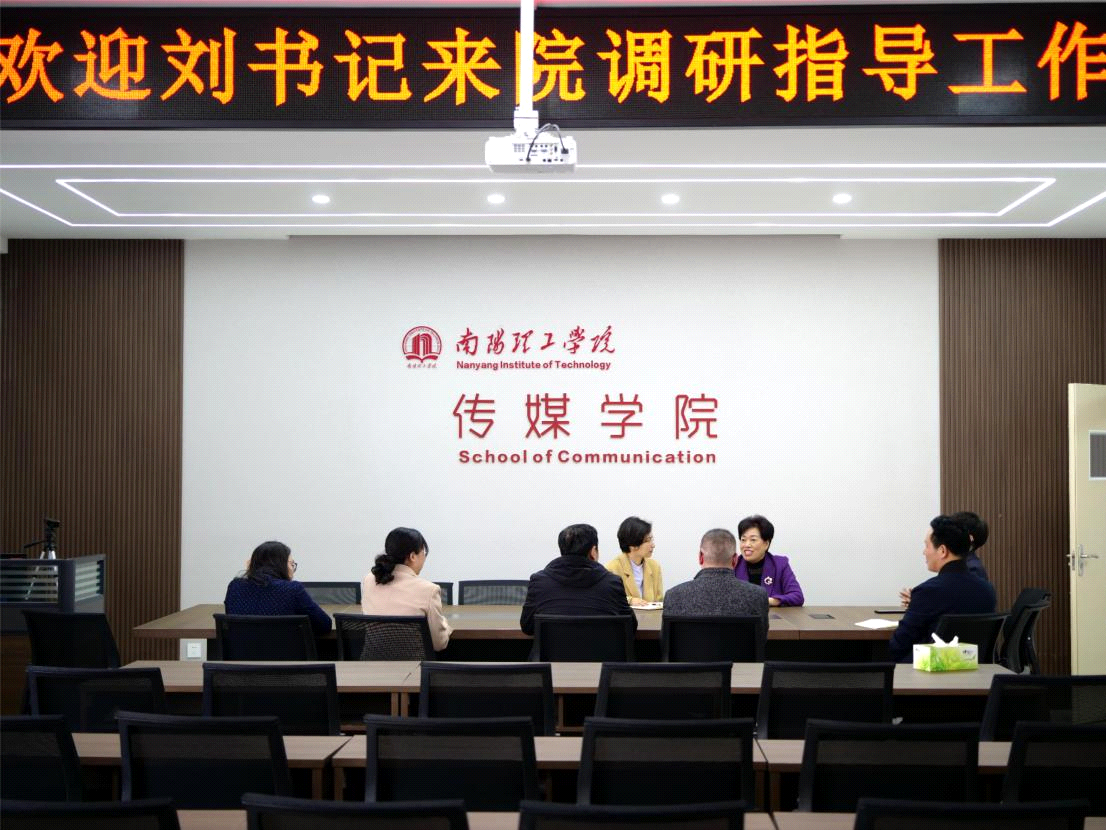 本网讯(特约记者/李铮)3月9日下午,南阳理工学院党委书记刘荣英深入传媒学院,调研指导学院建设和管理工作,传媒学院党委书记刘书营、院长李存、副书记陈飞、副院长骆志方参加了调研座谈。