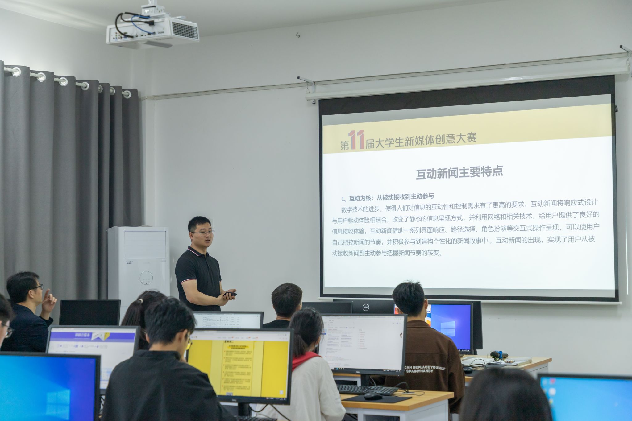 陈富豪结合第11届大学生创意大赛活动要求,结合历年新闻奖优秀案例,从H5交互作品的创意产生、内容选择与形式制作等方面,给同学们讲解了交互融媒体作品产品的常见形式,制作流程。他强调交互作品的的技术形式一定是为内容服务的,要结合国家政策导向做好内容的选择,并鼓励同学们积极参与第11届全国大学生新媒体创意大赛。