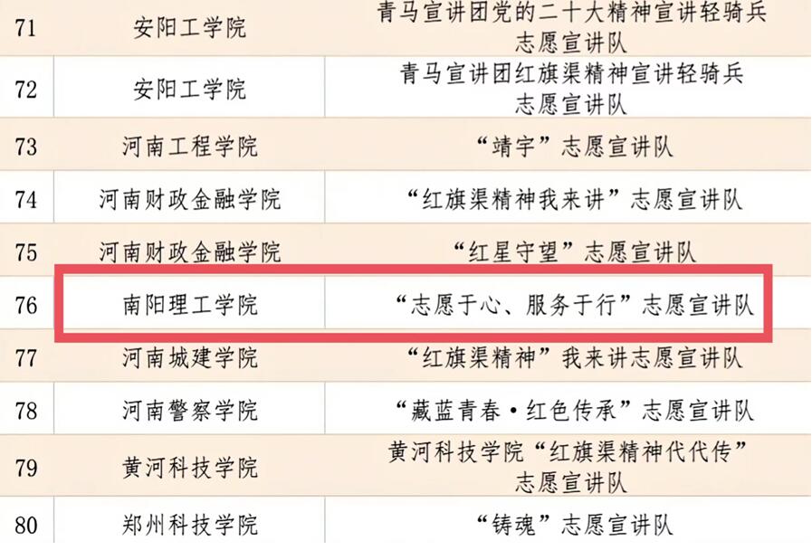 本网讯(特约记者/马孟涵)近日,由省委宣传部、团省委共同举办的河南省大学生“红旗渠精神代代传”志愿宣讲活动入选名单公布,我校“志愿于心、服务于行”志愿宣讲队成功入选。