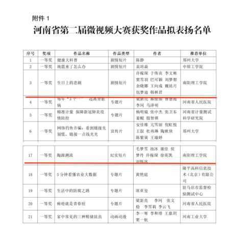 本网讯(特约记者/魏静思)近日,由省委宣传部、省科协、省科技厅、省应急管理厅、省市场监督管理局主办,中原工学院承办的河南省第二届科普微视频大赛评选结果公布。传媒学院代表学校报送的科普作品《生日上的悲剧》和《陶源溯流》在大赛中表现出色,均获得一等奖。