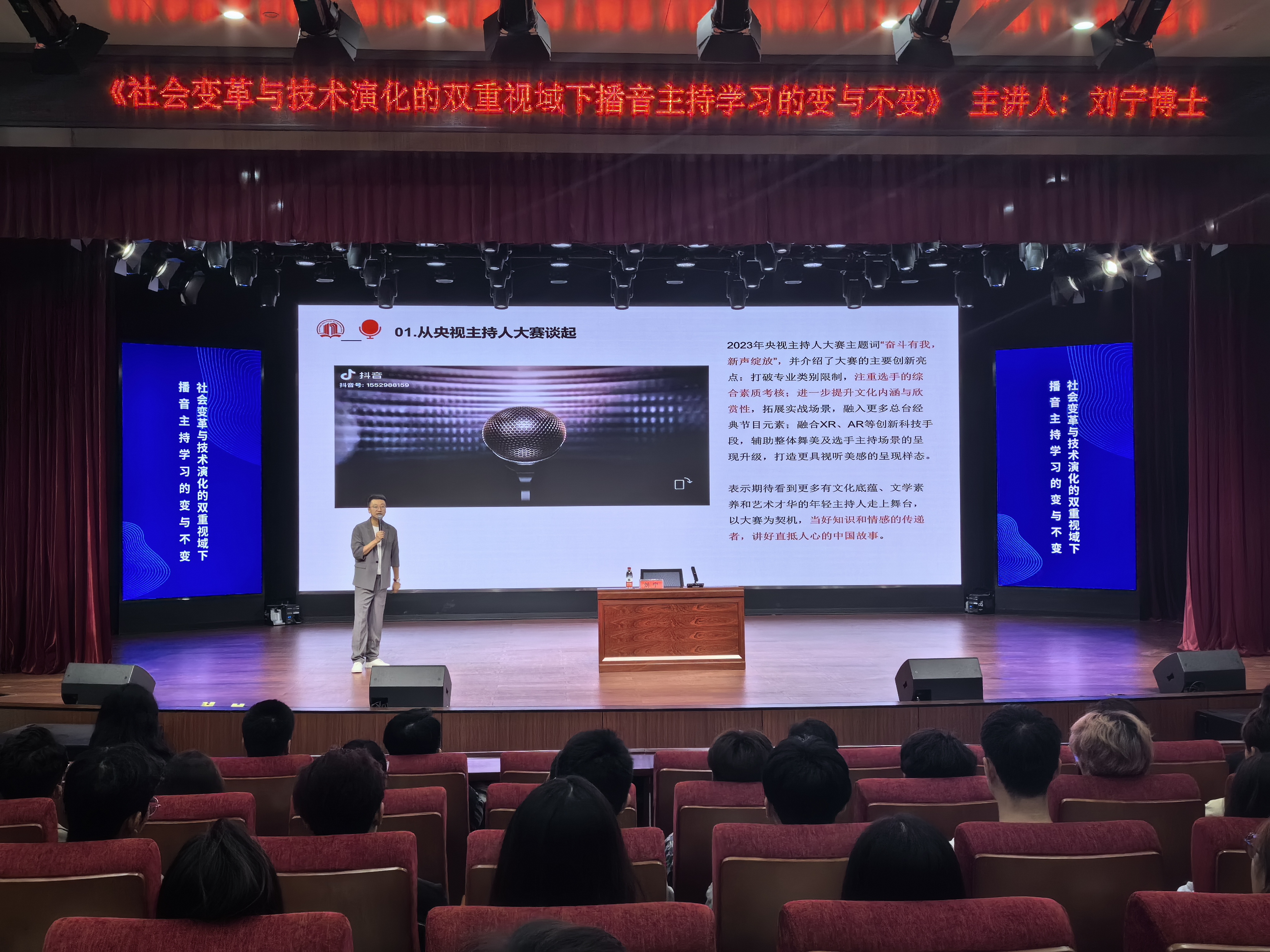 本网讯(特约记者/李艳丹)2023年9月26日下午,传媒学院邀请了上海大学博士生刘宁来我院开展题为《社会变革与技术演化的双重视域下播音主持学习的变与不变》的学术讲座,传媒学院院长李存、副院长骆志方及播音与主持艺术专业全体教师、21级、22级全体学生参加。