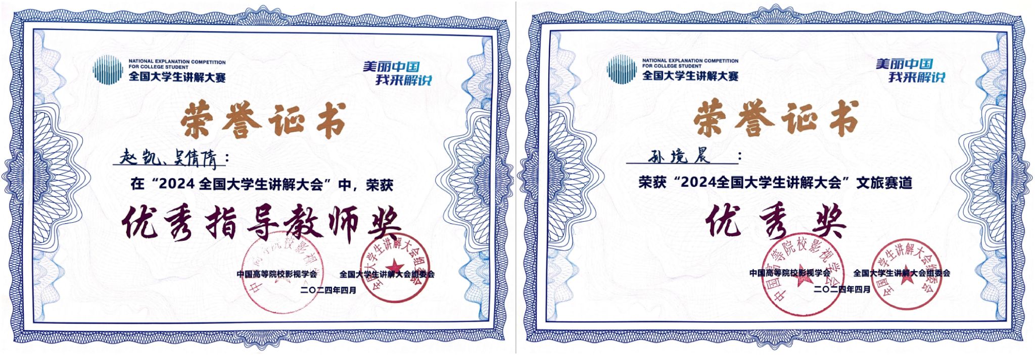 本网讯(特约记者/吴倩倩)近日,2024全国大学生讲解大会在山西大同落下帷幕,现场揭晓获奖名单。传媒学院播音与主持艺术专业学生孙境晨,从众多传媒类院校的专业选手中脱颖而出进入总决赛(文旅赛道),在复选现场将南水北调中线工程的背景、数据和故事巧妙融合,获“优秀奖”,指导教师赵凯、吴倩倩获“优秀指导教师奖”。