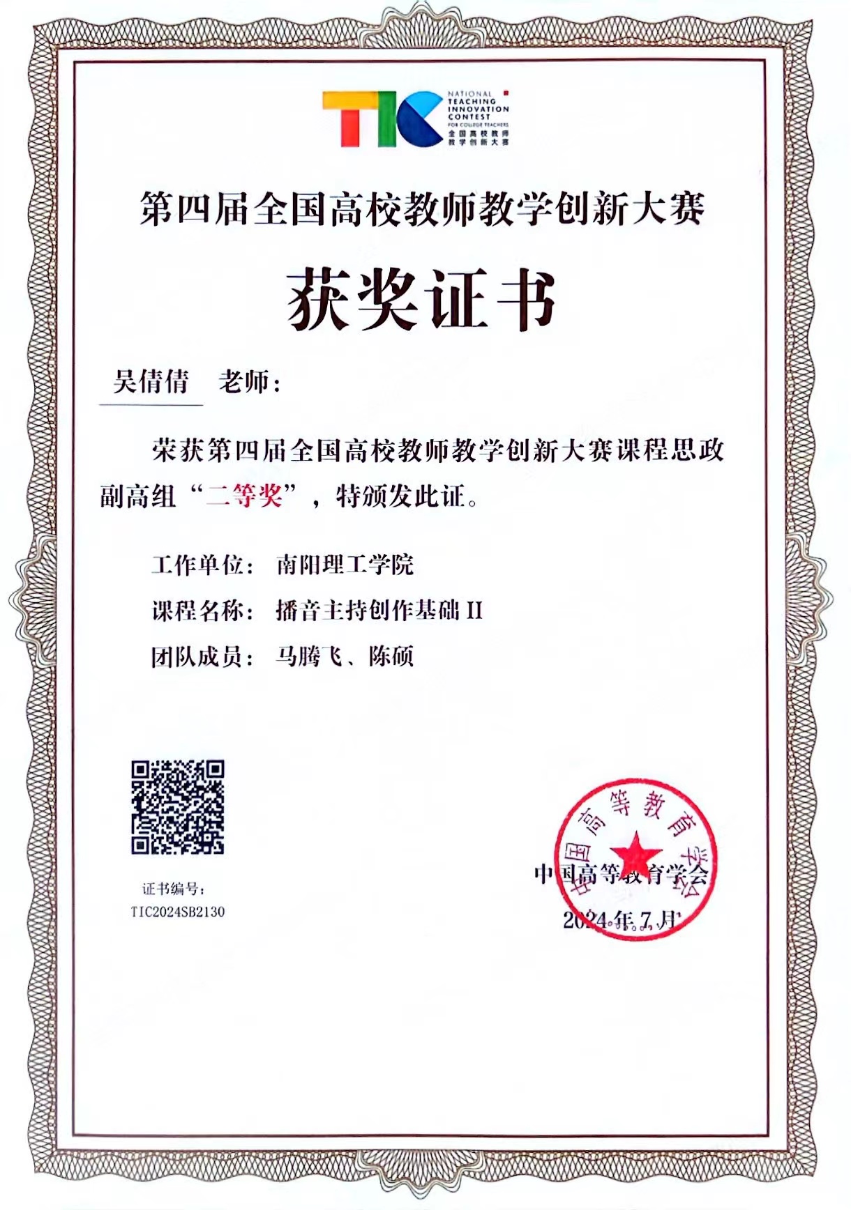 本网讯(特约记者/李志光)7月27日至31日,第四届全国高校教师教学创新大赛全国总决赛现场赛在四川省成都市电子科技大学举行,经过激烈角逐,我院播音与主持艺术专业教师吴倩倩脱颖而出,荣获课程思政副高组二等奖,这是继我院首届全国高校教师教学创新大赛三等奖后的一次突破,也是我校目前在此比赛中获得的最高奖项。